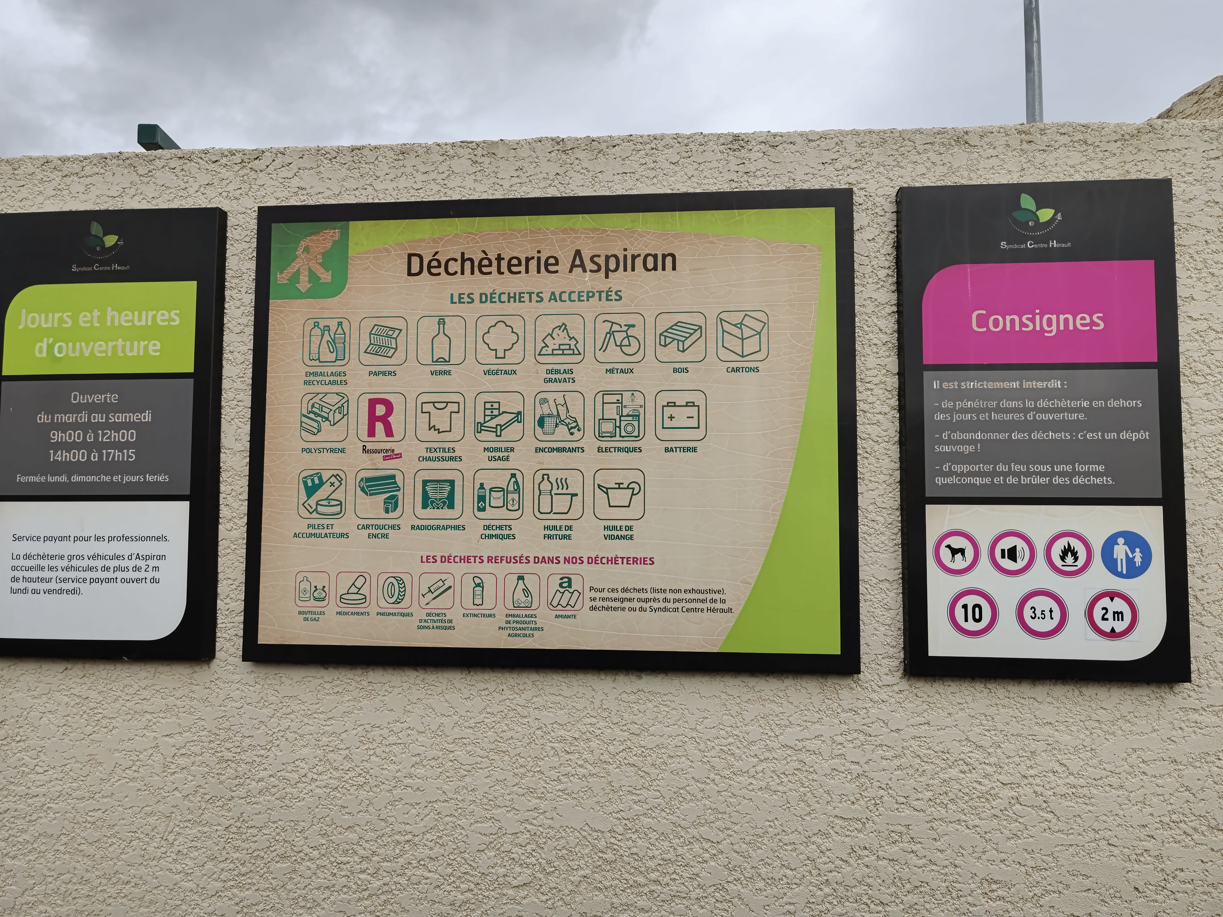 Déchèterie fermée du vendredi au mardi et comme celles des autres communes environnantes sont fermées elles aussi (au lieu de faire un roulement) nous sommes allés jusqu’a Montagnac et là on s’est fait refoulé car nous ne sommes pas de la commune Et Après on s’étonne de voir des poubelles dans la nature….